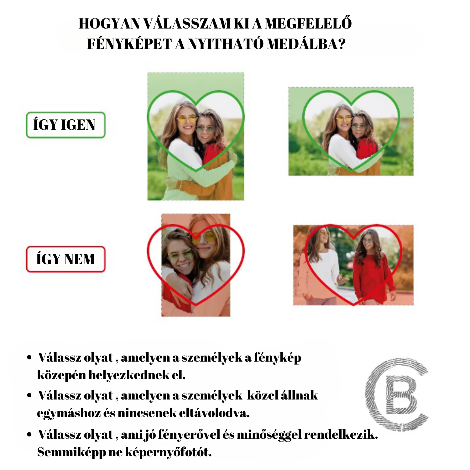 A honlapon van egy magyarázó kép, hogy milyen legyen a fotó, hogy jól illeszkedjen a medálba.Tiszta kép kell, elegendő hely a háttérben, hogy a feldolgozás során ne vágja ki az embereket.