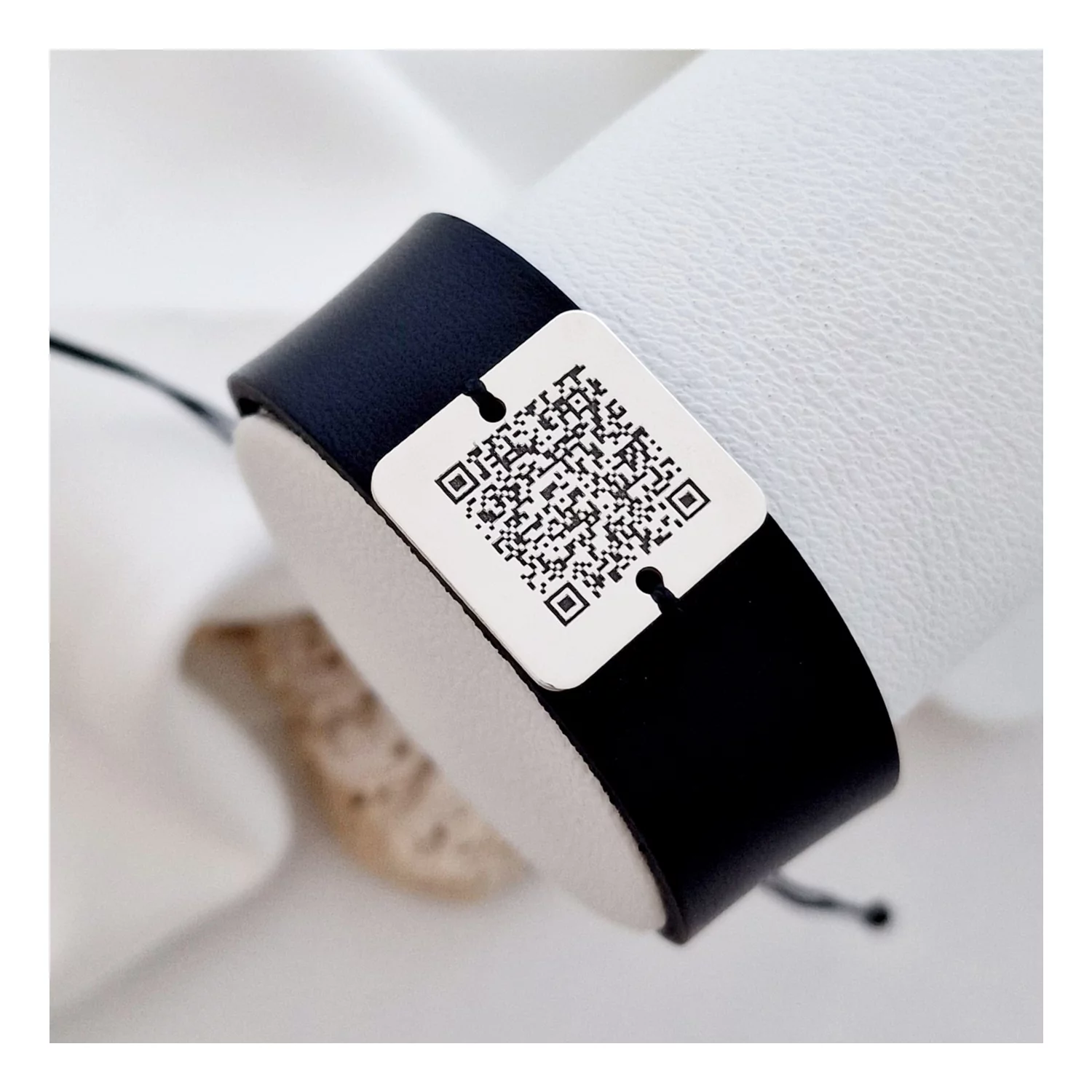 Széles Bőr Karkötő Ezüst QR Kód Lemezzel