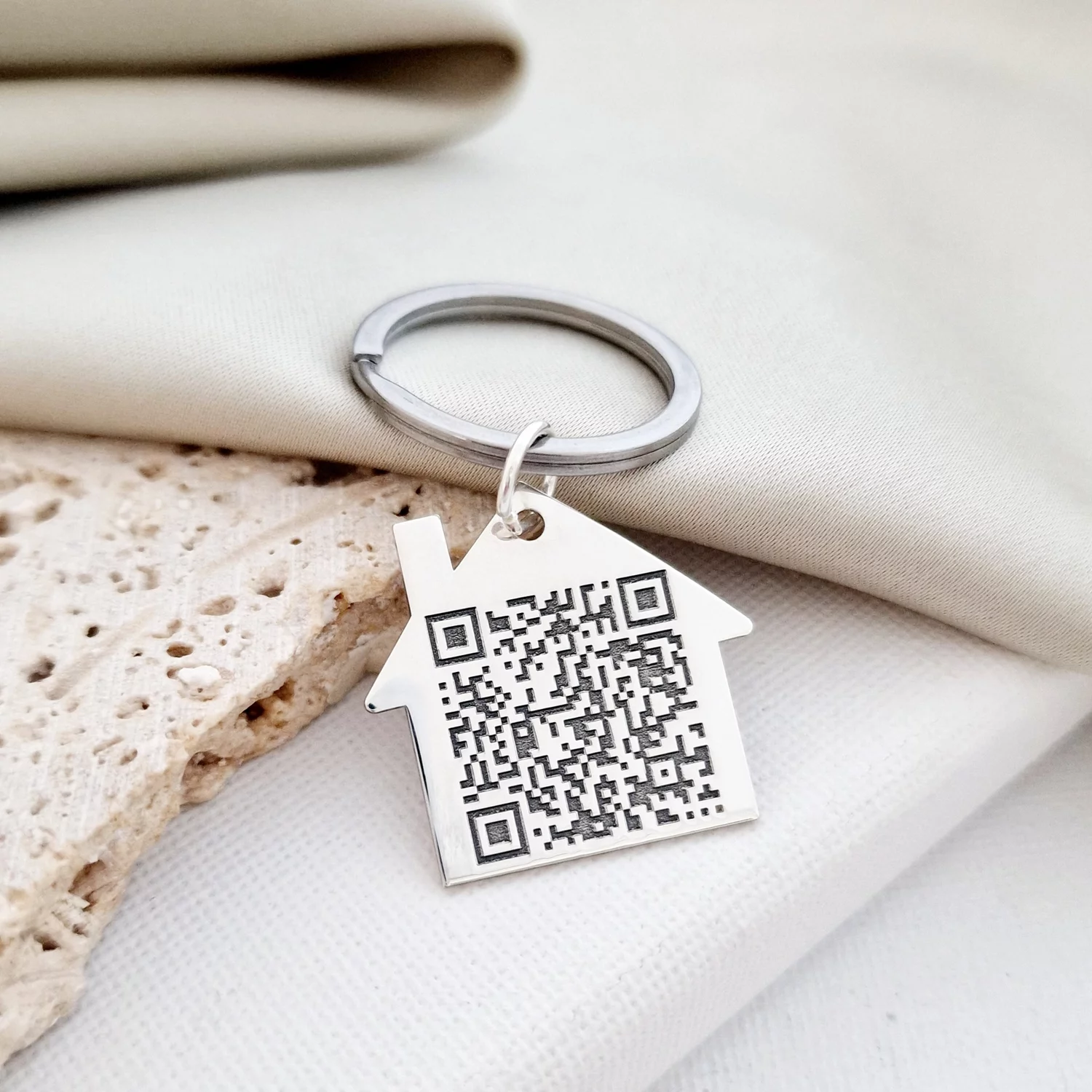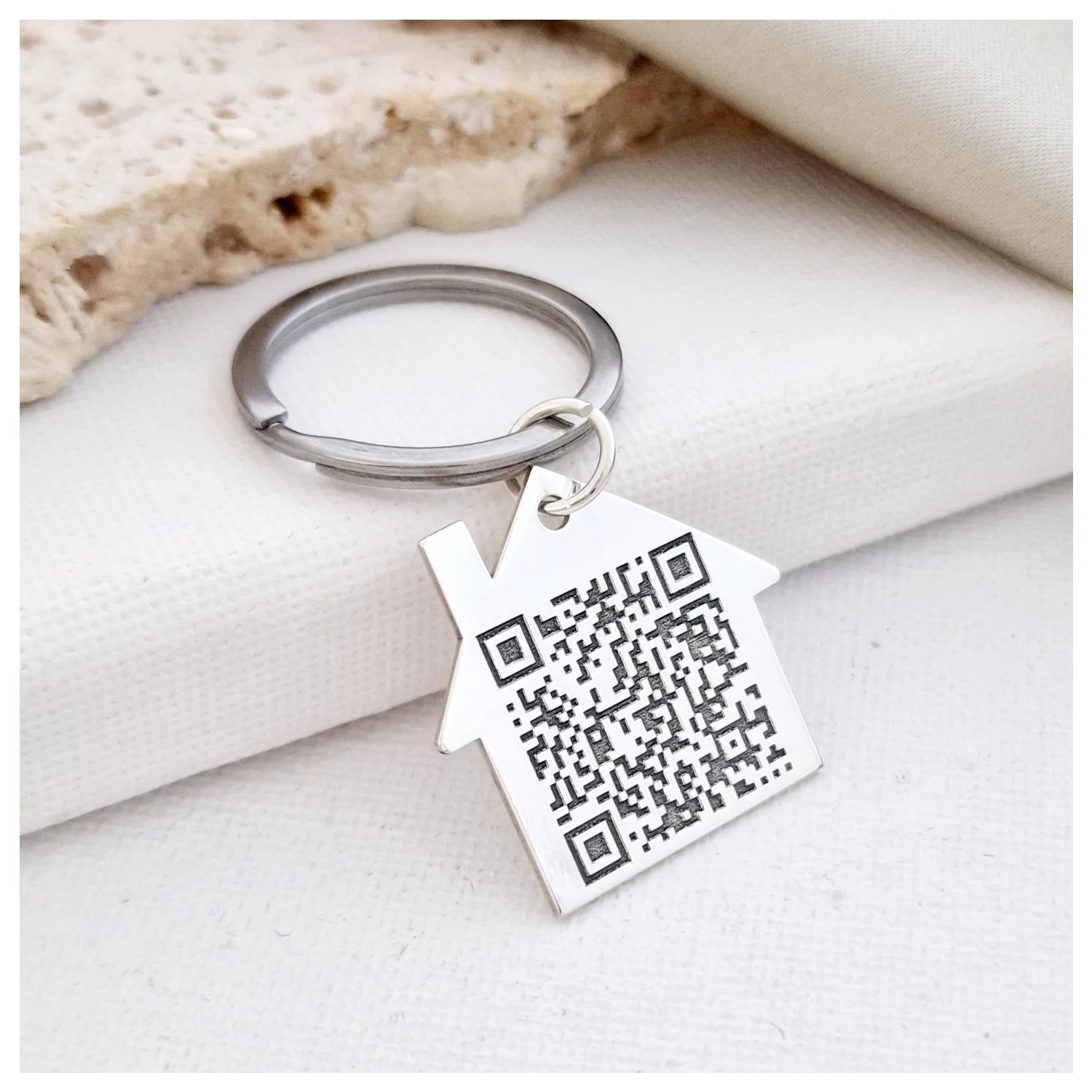 QR Kódos Kulcstartó - 925 Sterling Ezüst Házikó - Rozsdamentes Acél Karika