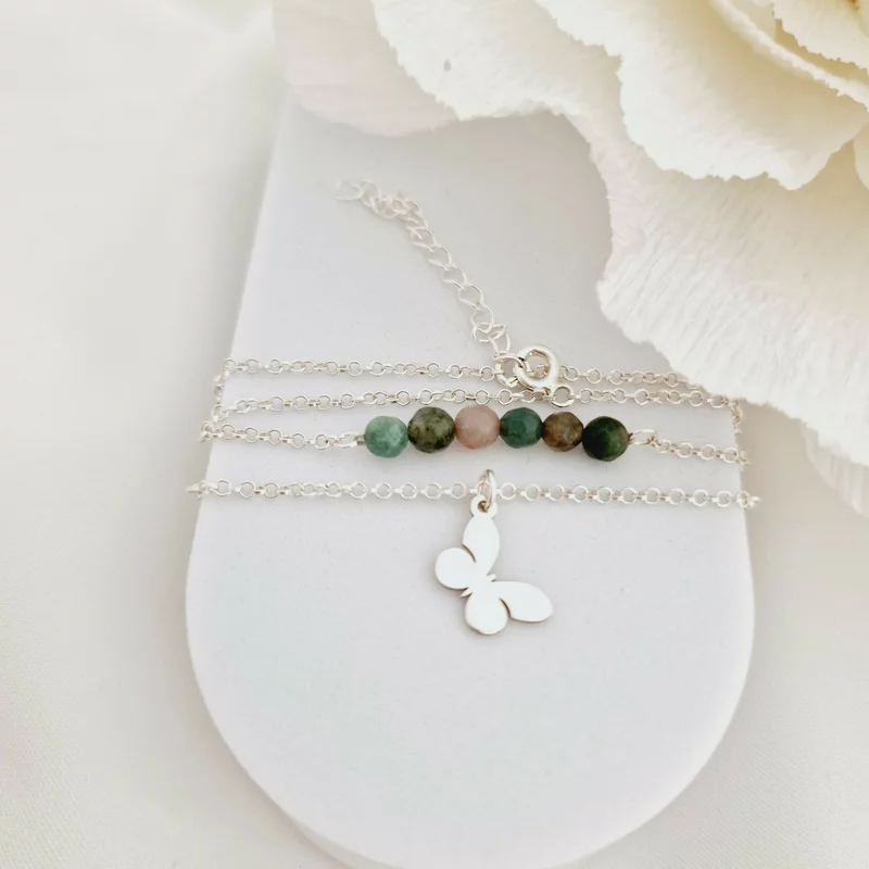 Fedezze fel az eleganciát és a szimbolikát az achátgyöngyös pillangó karkötővel. Az átalakulás és a szabadság gyengéd kifejezése egy diszkrét dizájnban.