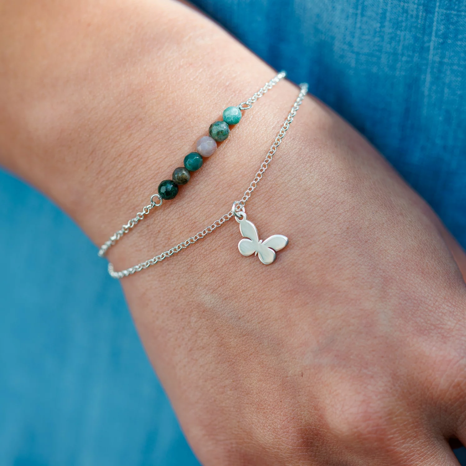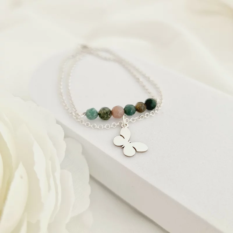 ÉLETERŐ Karkötő - Örök Átalakulás - 925 Sterling Ezüst dupla sor lánc és Pillangó Charm - Achát Ásvány Gyöngyökkel