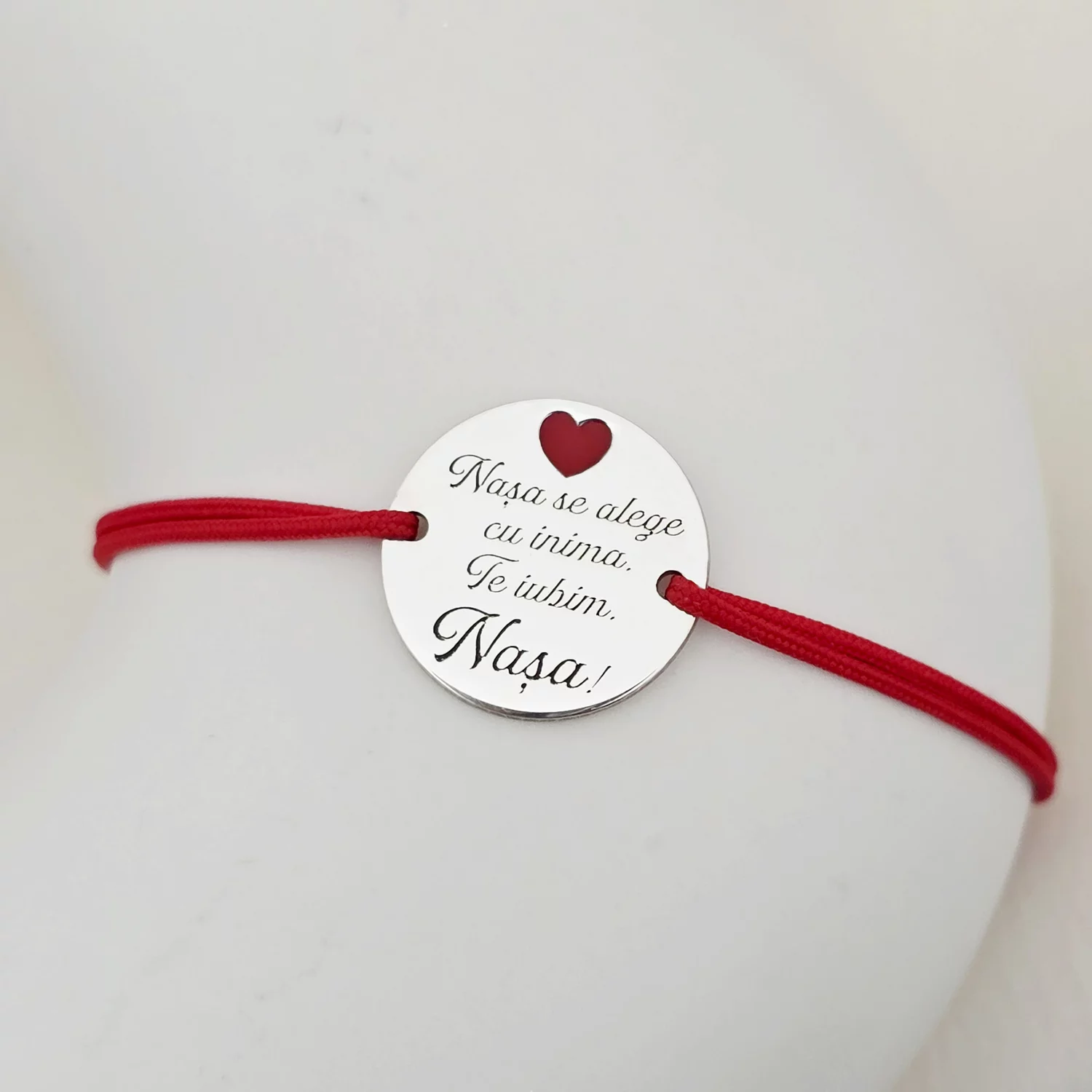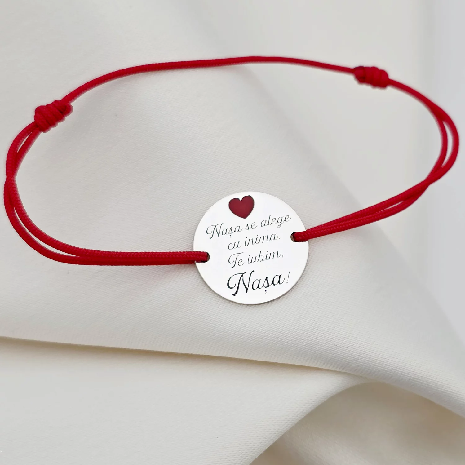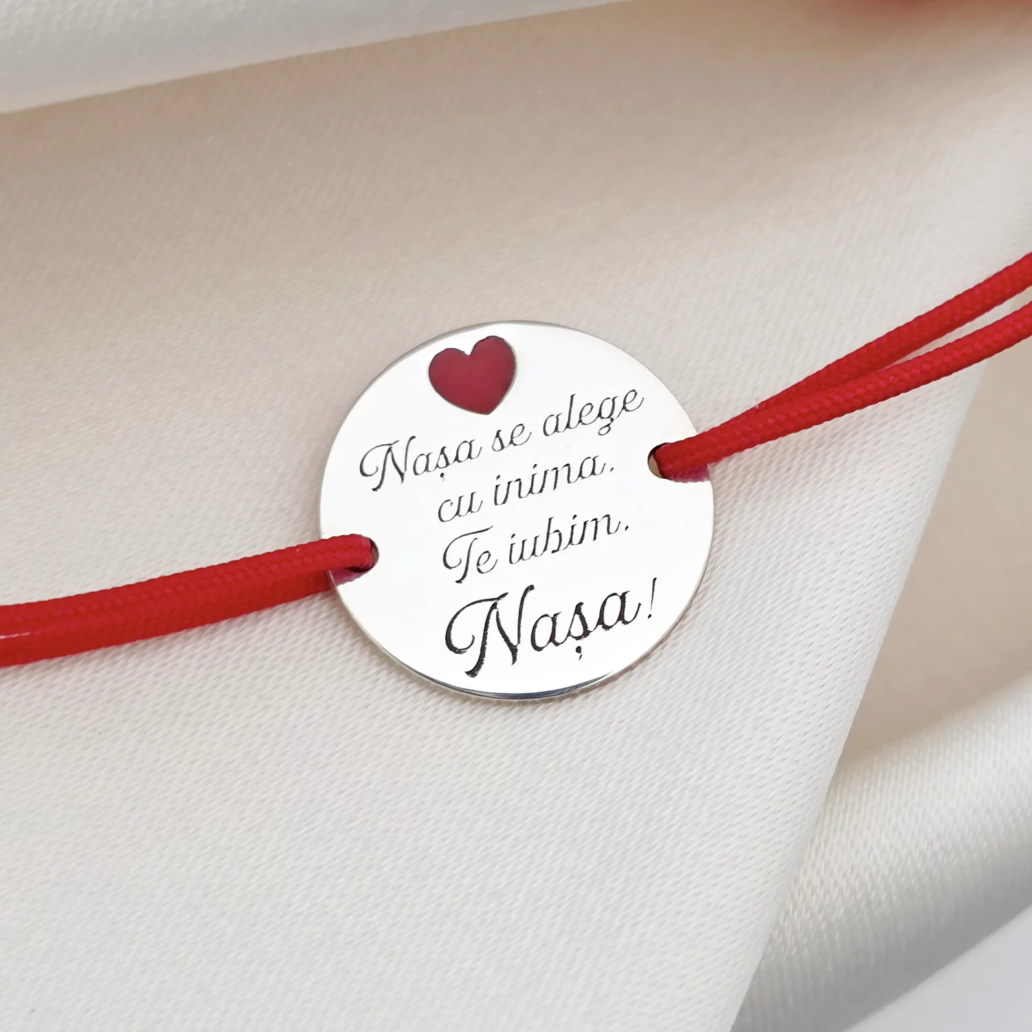 Keresztanyám karkötő – Ezüst szívvel, piros zománccal – Állítható zsinór
