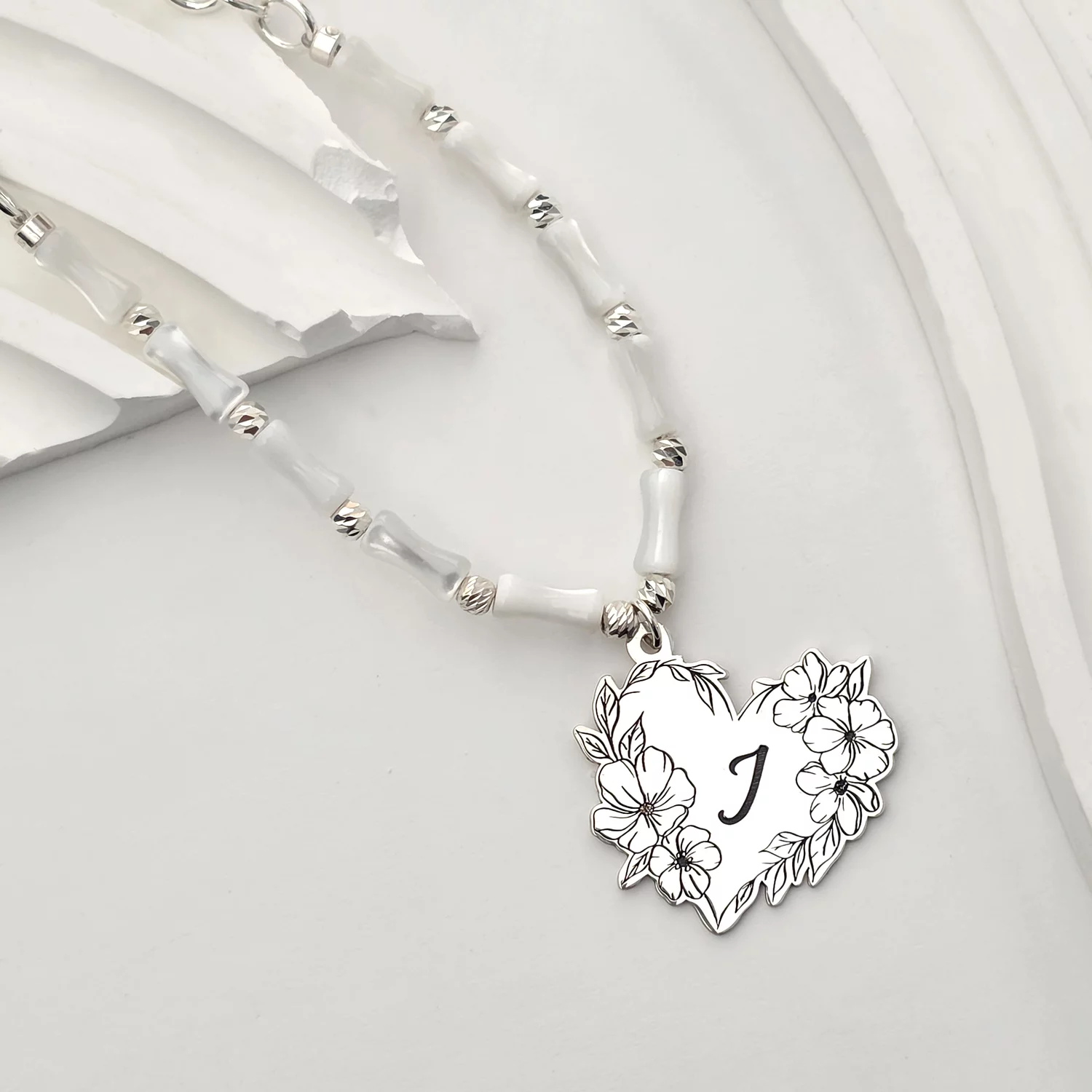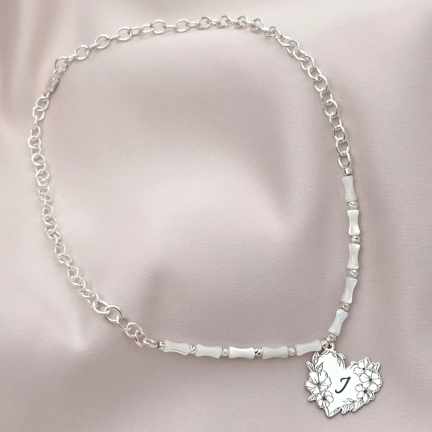 Virágcsokor Szívből Nyaklánc – Bambuszgyöngyök és Golyók – 925 Sterling Ezüst