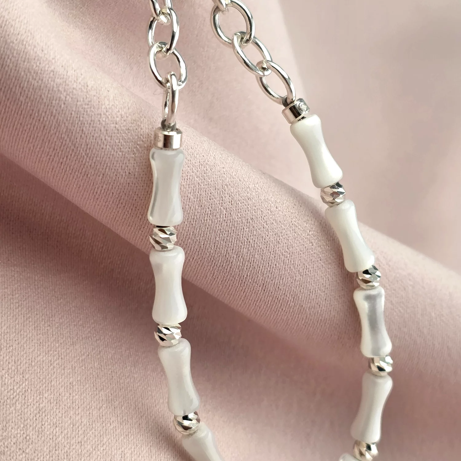 A tenyésztett bambuszgyöngyök és a 925 sterling ezüst apró golyók harmóniája elegáns, mégis természetes megjelenést kölcsönöz ennek a különleges ékszernek – tökéletes választás a mindennapokra és különleges alkalmakra egyaránt.