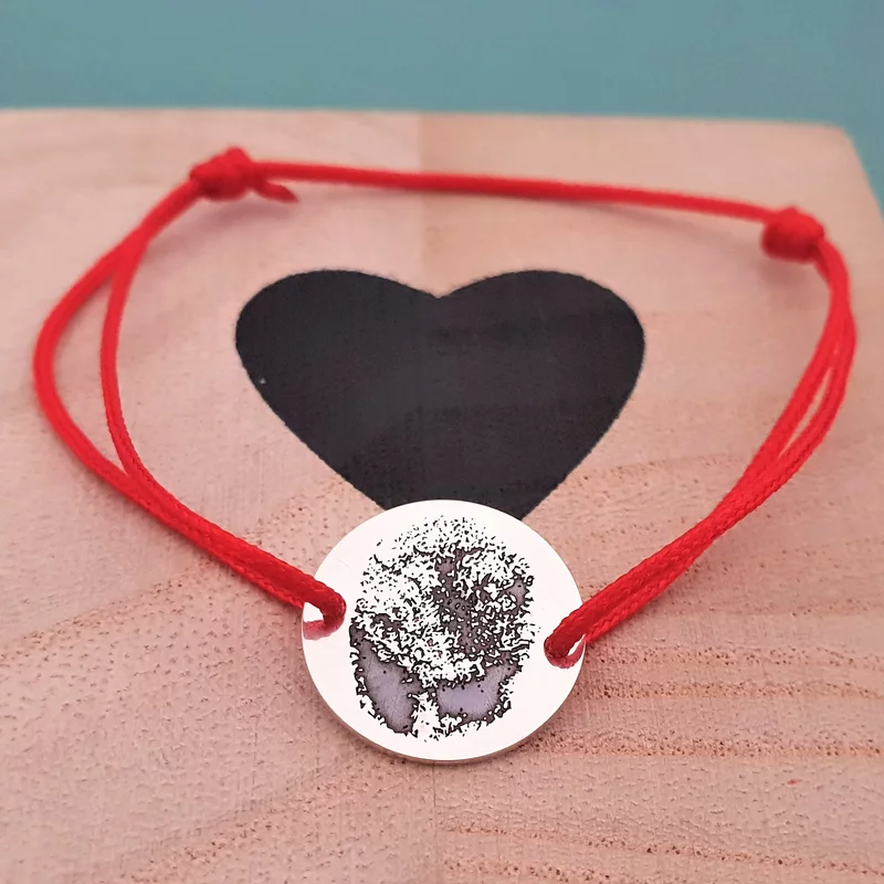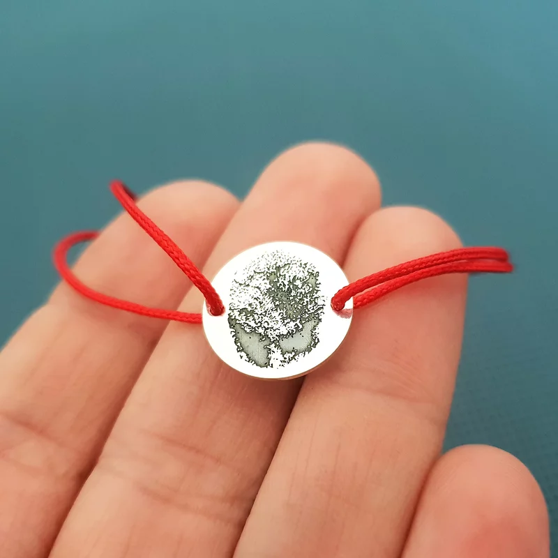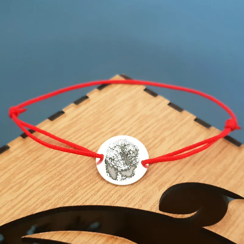 Érme karkötő ujjlenyomattal - Ezüst 925, piros zsinór