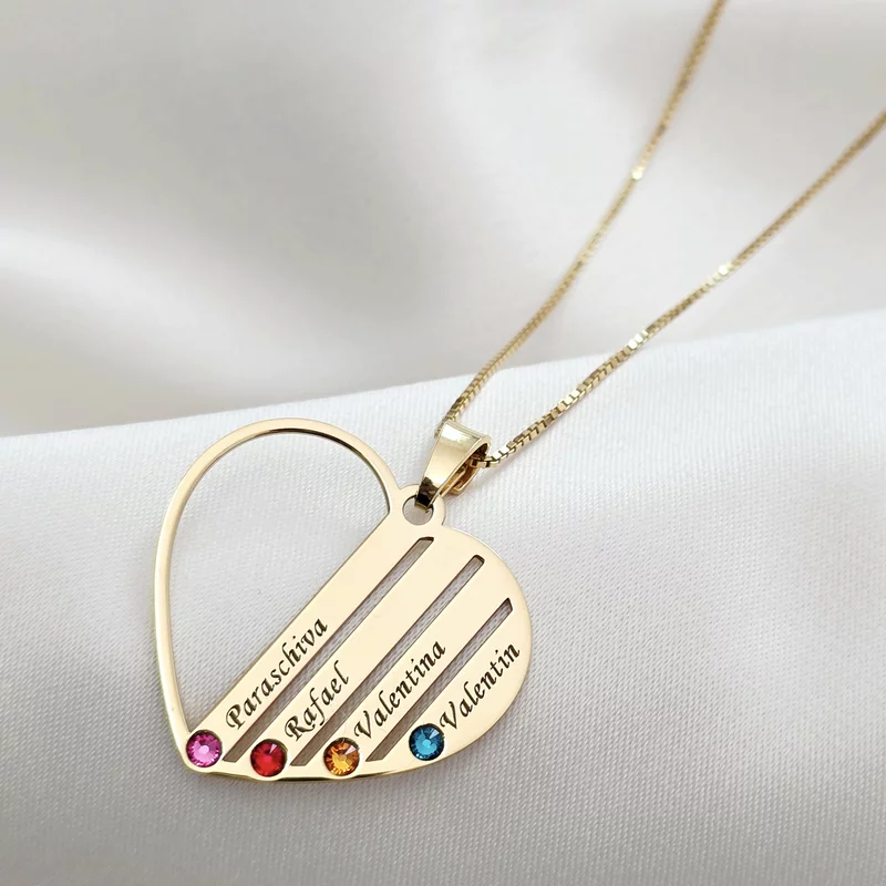 A szív alakú család-nyakláncot akár 7 taggal is személyre szabhatod, a medálba gravírozott nevekkel és Swarovski kristályokkal, születési hónap vagy tetszés szerint.