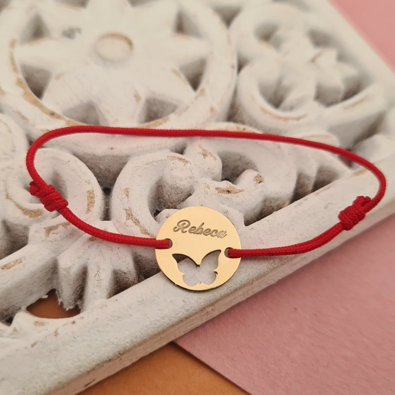 Aranyos Pillangó karkötő - Egyedi 12 mm átmérőjű névvel ellátott érme - 14K sárga arany - Állítható zsinór, többféle színben